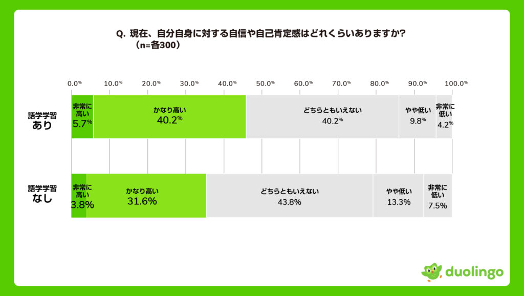 語学学習は、私生活の充実度にも直結します。Duolingoの調査によれば、学習者は非学習者に比べ、自己肯定感が高いだけでなく、新しい学びへの意欲が約2倍も高いという結果が出ています。