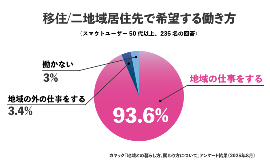 一方、「働くこと」への意欲は、非常にアグレッシブです。地域とつながるプラットフォーム『スマウト』の調査によれば、移住や二拠点生活に関心を持つ50代以上の93.6%が「移住先での就業」を希望!