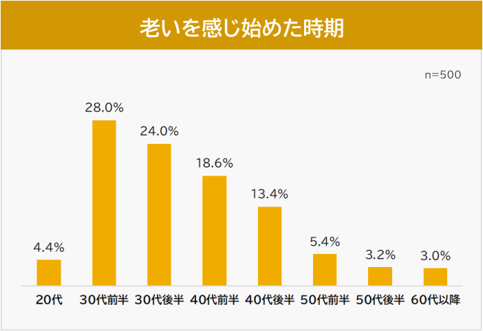 ライズ・スクウェアが30代以上の男女500人を対象に行った調査によると、最も多かった回答は「30代前半(28.0%)」。この時期を境に、多くの人が年齢を意識し始めるという実態が浮き彫りになりました。