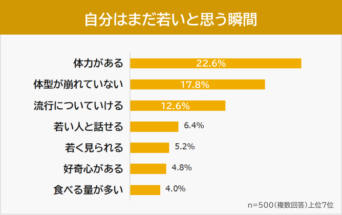実際、「自分はまだ若い」と断言する理由の第1位は「体力がある(22.6%)」、第2位は「体型が崩れていない(17.8%)」という結果に。このデータからもわかるように、若さの維持は、日々の体をいかに正しくメンテナンスし続けているか、その一点に直結しているのです。