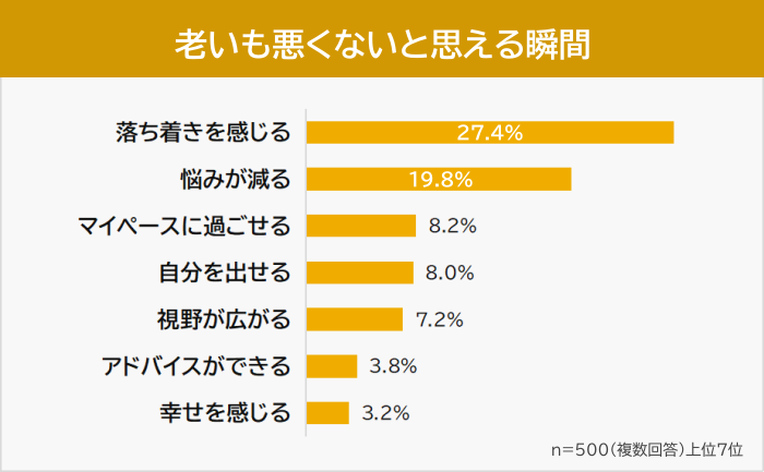 年齢を重ねることは、決して何かを失うことばかりではありません。事実、アンケートには「老いも悪くないと思える瞬間」について、驚くほどポジティブな声が数多く寄せられました。