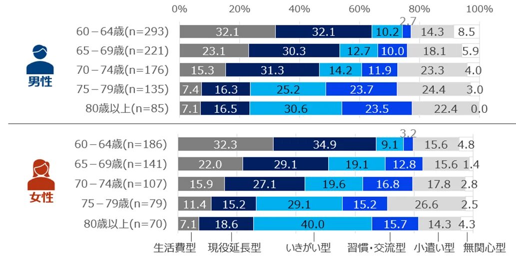 - 男性の場合: 60~70代前半までは「現役延長型(紺色)」の割合が高く、社会との接点を「仕事」に置く傾向が強く残ります。