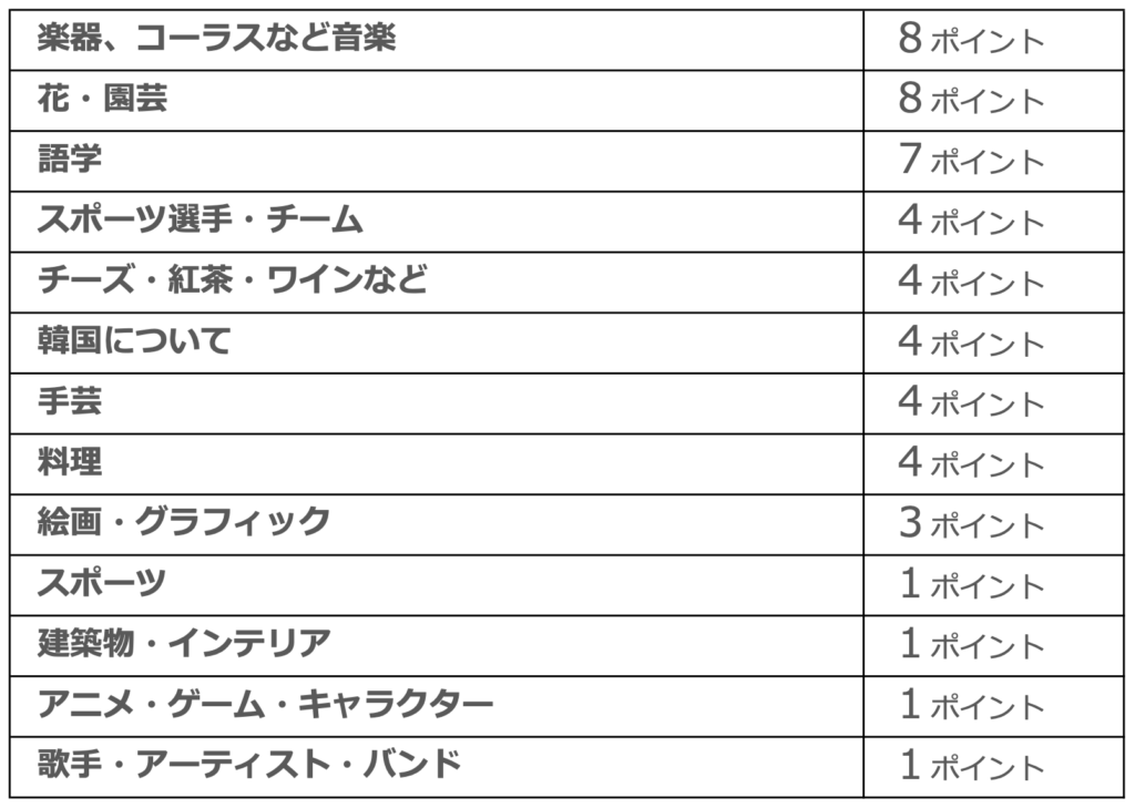 人気が高かったのは、「楽器・コーラスなどの音楽系」「花・園芸」の2つでしたが、それらに次いでポイントが集まったのが「語学」です。